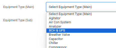 Input Equipment Type (Main) from the dropdown list. Input Equipment Type (Sub) if applicable, in the input field provided. Approach your M-DB administrator if there is a new Main Equipment Type.