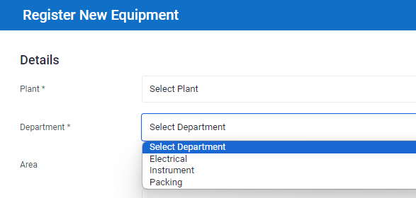 Select the correct Plant and Department from the dropdown lists. Input Area information in the input field provided, if applicable. Note that you can sort the Area information when searching for equipment.