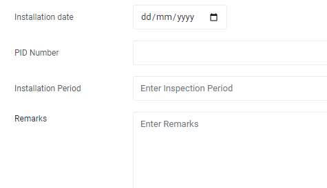 Select the Installation Date from the date selector. Input PID Number, Installation Period and Remarks for the equipment if applicable, in the input fields provided.