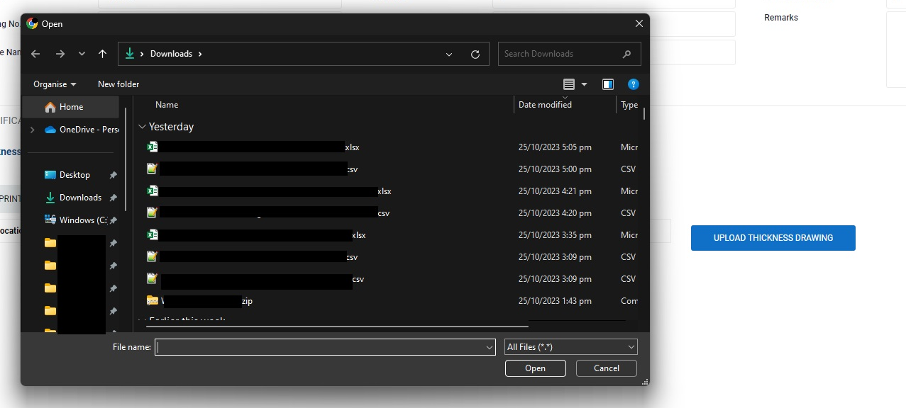 A File Explorer application on your local machine will appear. You can select the Thickness Drawing you wish to upload from your local computer. (Only image file with extension jpeg, jpg, jif and png are allowed). Multiple Drawings is allowed.