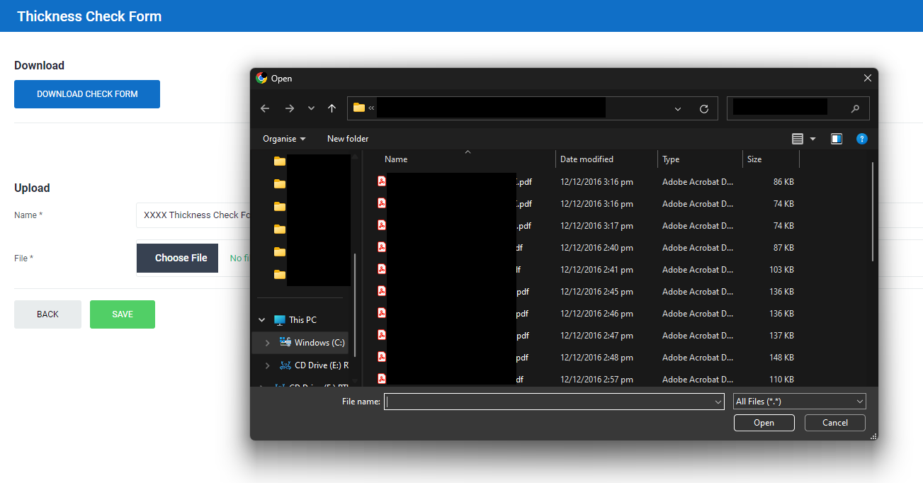 Input the name of the Thickness Check Form and click on Choose File. A File Explorer application on your local machine will appear. You can select the Thickness Check Form you wish to upload from your local computer.