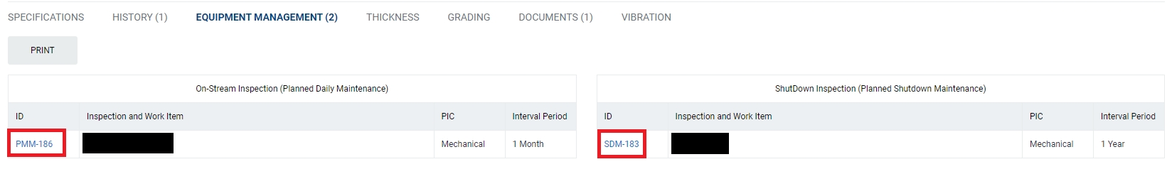 Under Equipment Management, user will be able to see the PM Master Plans (PMM) and the Shutdown Management Master Plans (SDM) that is created for this equipment. To see the details of the plans, user can click on the PMM or SDM No.