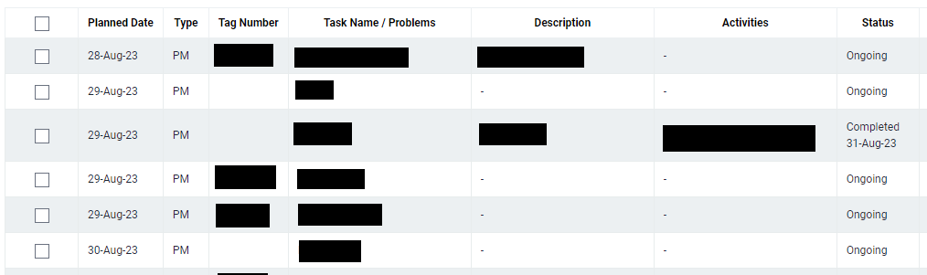 All relevant matches will be displayed in the resultant table. For PM Task that is not completed, status will be "Ongoing".