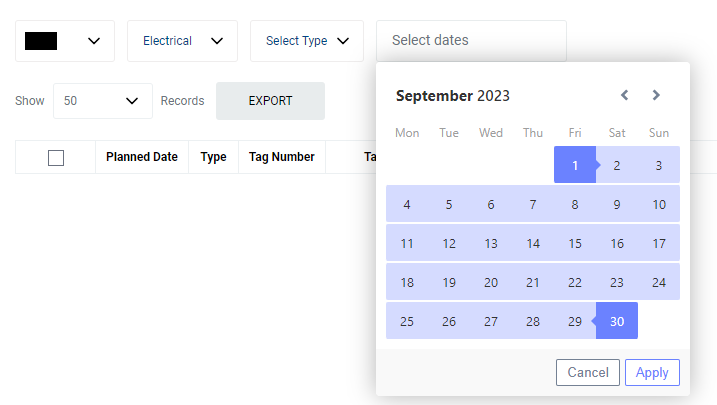 Select the correct Plant and Department information from the drop down list. You can filter the result by selecting the Type. Select the date range that you wish to view from the Date Selector. Please note that your first click will select the From Date, and your second click will select the To Date. Click Apply to confirm.
