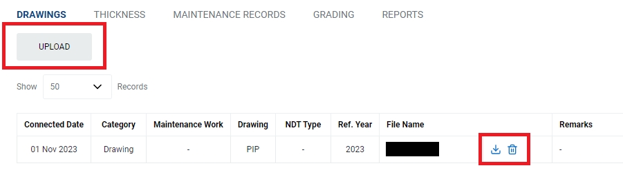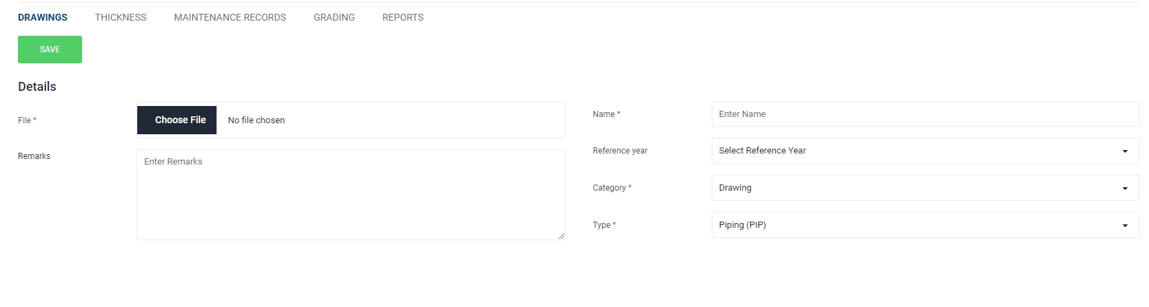 To Upload Drawing of Piping, Click on the Upload button. Click on Choose File. A File Explorer application on your local machine will appear. You can select the Drawing file you wish to upload from your local computer. Input Name, Reference year, Category and Type. Click Save to upload the file.