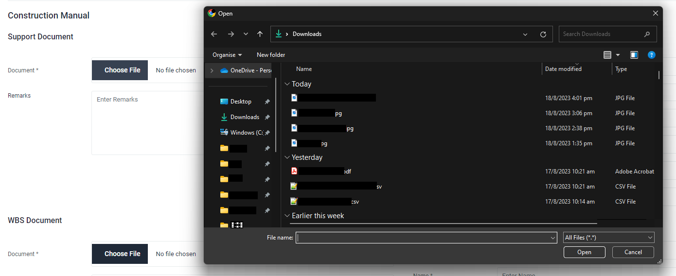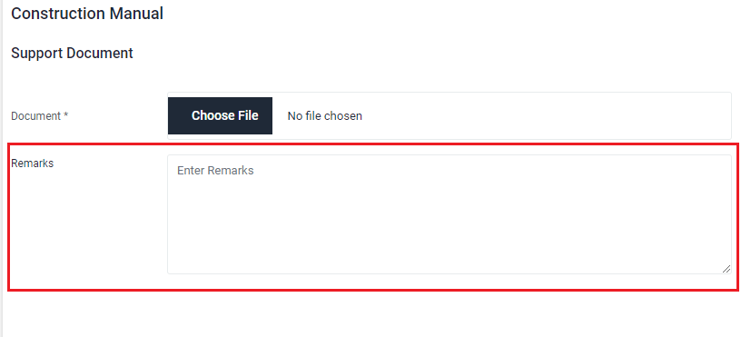 If there is/are document(s) you wish to upload, make sure you upload under the correct category. There are 3 categories you can upload your documents to, namely Construction Manual Support Document, WBS Document and Check Sheet Document.