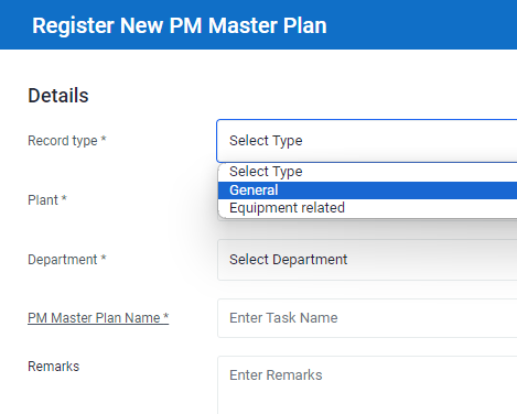 Select the Record type. For equipment related PM, please choose Equipment Related. For non-equipment related PM, you can choose General (without any link to equipment).