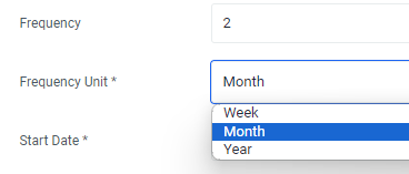 Input the Frequency and the Frequency Unit. E.g. If you put Frequency: 2, and Unit: Month, it means the task is scheduled once every 2 months. If you input Frequency 4, and Unit: Week, it means task is scheduled once every 4 weeks. Note: The highest frequency you can set for a PM Task is weekly, i.e. Frequency: 1, Unit: Week.