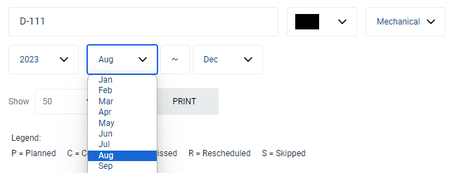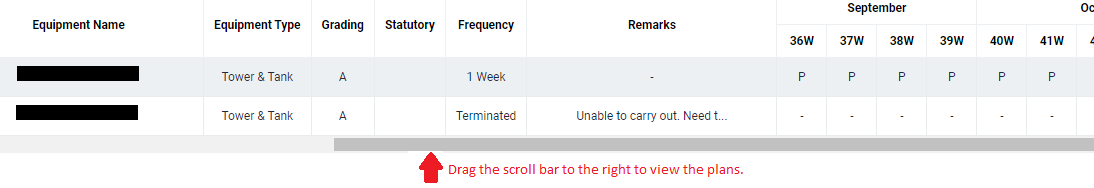 All relevant matches will be displayed in the resultant table. Please note that the PM Plan is displayed by week, and you can drag the scroll bar to the right to see the weekly tasks.