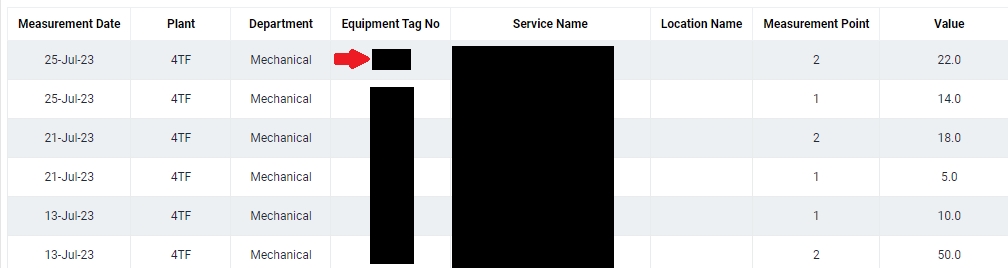 Select the correct plant information and department from the drop down list and input the tag number that you are searching for. You can input a sub-string of the tag number instead of the full tag number, i.e. you can input 101 to locate a tag number A-101. Hit "Enter" to invoke the search.