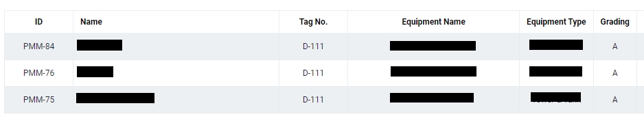 Select the correct plant information from the drop down list and input the tag number that the PM Master Plan is created for. You can input a sub-string of the tag number instead of the full tag number, i.e. you can input 111 to locate a tag number D-111. Hit "Enter" to invoke the search.