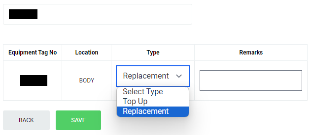 Allows user to input Lubrication Record for an equipment. Please note this feature may not be available for all equipment. Also note that all fields marked with (*) must be filled out.