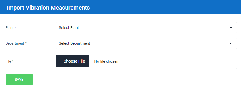 Allows user to upload Vibration Record for an equipment. Please note this feature may not be available for all equipment. Also note that all fields marked with (*) must be filled out.