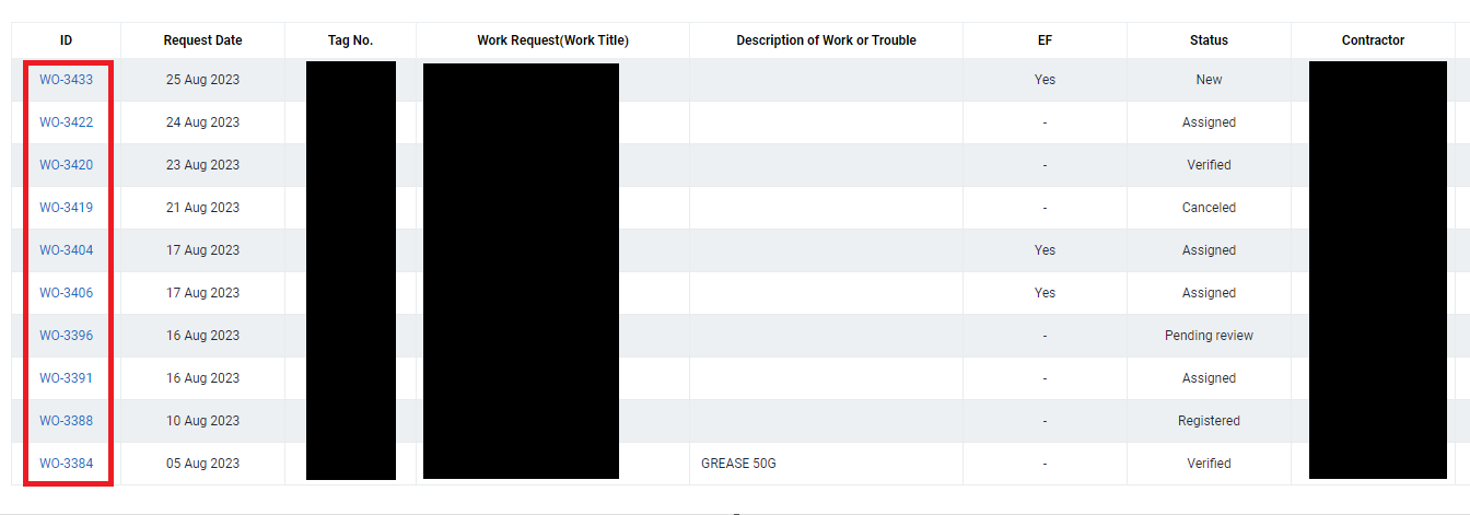 Click on the Work Order ID you wish to assign to a contractor. Please note that you can only assign a Work Order with the status "Registered".