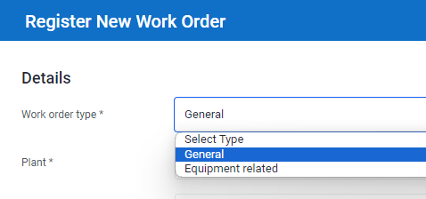 Select the Work Order Type. Work orders, whether General or Equipment Related, will be associated with both a Plant and a Department. However, only Equipment Related work orders will additionally be connected to an Equipment tag.