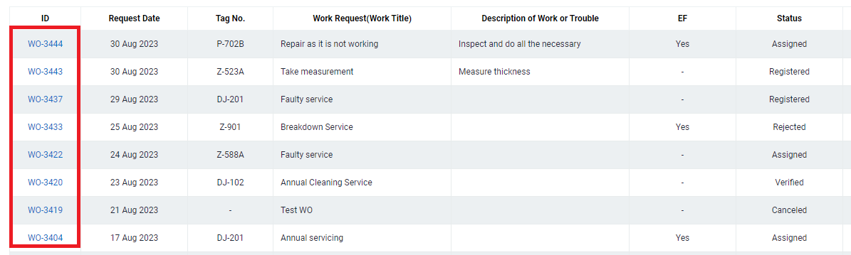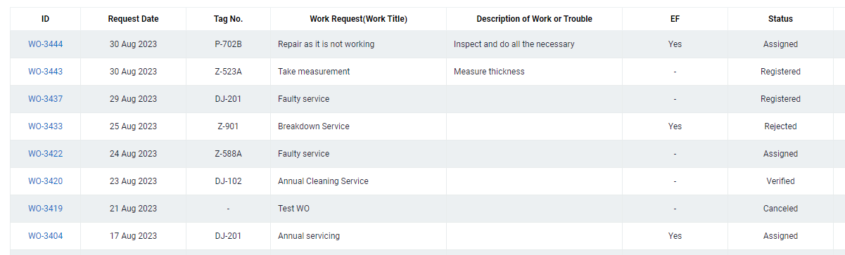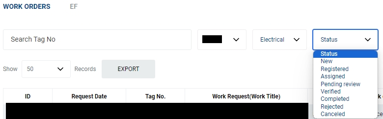 Select the correct plant information from the drop down list and input the tag number that you are searching for. You can input a sub-string of the tag number instead of the full tag number, i.e. you can input 101 to locate a tag number A-101. Hit "Enter" to invoke the search. You can filter the result by selecting the status.